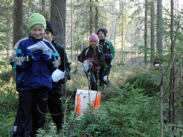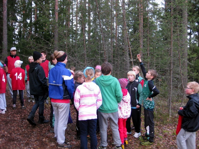 Kettujen ohjausta suunnassakulkuharkassa    Seuraava ohjelma oli Annin suunnittelema ja junailema lipunryöstö. Kaksi joukkuetta, ohjaajat sivussa. Vankilatkin oli kummankin joukkueen oman alueen kulmassa. Ensimmäinen erä meni vähän yksityisyritteliäisyyden nimissä. Isommat nuoret eivät halunneet katsella sivusta, vaan liittyivät mukaan toiseen erään. Nyt tuli joukkuetaktiikka mukaan. Toiminta muuttui suunnitelmalliseksi. Peli jäi ratkaisemattomaan tilanteeseen kymmenen minuuttia ennen ruoka-aikaa, koska erään nuoren hieno kosketusnäytöllinen kännykkä oli pudonnut maastoon (Oppi: kännykät pois tällaisesta menosta tai sitten vetoketjulliseen taskuun). Laitettiin pystyyn avorivi ja edettiin ensin pohjoisreunaa pitkin. Ei löytynyt. Paluumatkalla eteläreunaa pitkin Verneri sitten löysi kännykän. Oppia saatiin tästäkin: Yhdessä järkevästi toimimalla löytyy vaikka neula heinäsuovasta tai kännykkä kuusikosta. Vaihteeksi taas syötiin, tällä kertaa herkullista spagettia ja upeasti maustettua jauhelihakastiketta.