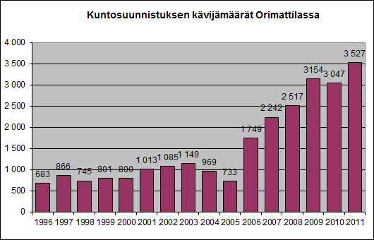 Kasvun vuosi 2011Kauden päätteeksi on taas tilastoitu toiminnan määrää ja ilahduttavasti ainakin kahdella tärkeällä sektorilla on menty vuosi vuodelta eteenpäin. Orimattilan Iltarastien sekä nuorten, alle 14-vuotiaiden kilpasuunnistajien määrät ovat kasvussa edellisvuosien tapaan.    Orimattilan Iltarastit on saavuttanut vankan sijan paikkakunnan liikuntapalveluiden tuottajana ja keräsi kaudella 2011 keskiarvona 147 suunnistajaa illassa. Saavutusta voidaan pitää huikeana kun katsellaan kasvukäyrää ja muistetaan että vielä vuonna 2005 kävijämäärän keskiarvo oli 30,5 suunnistajaa / tapahtuma. Kerrassaan uskomaton toiminnan aktivoituminen, josta kiitokset kaikille järjestäjille ja Orimattilan Iltarasteilla käyneille suunnistajille! Alla oleva kuvaaja kertoo osaltaan historiaa menestyksen takana.