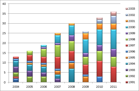 Orimattilan Iltarastien kävijämäärän kehittyminen 1996-2011.    Toinen seuratoiminnan ja kilpailutulevaisuuden kannalta erittäin positiivinen trendi on nuorten, alle 14-vuotiaiden kilpasuunnistajien määrän kehittyminen. Kaudella 2011 kansallisissa tai sitä isommissa kilpailuissa kävi 36 eri lasta, joka on Rastivarsojen seuran tähänastisen historian suurin määrä. Kilpailuaktiivisuus on monella lapsella merkittävä tekijä harrastuksen jatkuvuuden kannalta ja sen vuoksi tätä tulosta voidaan pitää erityisen ilahduttavana. Oheisessa kuvaajassa kisaajat on luokiteltu syntymävuoden mukaan. Tulevalla kaudella iso 1997-syntyneiden ikäluokka kasvaa tästä tilastoinnista ulos, joten toivottavasti saamme nuoremmista vastaavasti taas uusia innokkaita kisaajia mukaan!
