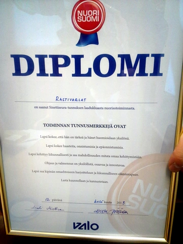 Nuori Suomi -sinetti uusittu   Sinettidiplomin luovutus    Nuori Suomi -auditoijat Anneli Miettinen (SSL) ja Krista Pöllänen (PHLU) saapuivat keskiviikkona 12.6. auditoimaan seuramme nuorisotoiminnan. Paikalla oli puheenjohtajamme Timo Hämäläisen johdolla seuratoimijoita ja nuoria.    Varsinainen auditointiraportti tulee myöhemmin. Tässä muutamia poimintoja. Arviointitasot olivat alhaalta ylös: Ei täytä kriteereitä, riittävä, hyvä sekä erinomainen.    Yhteisöllisyydestä ja yksilöllisyydestä auditoijat totesivat, että se on erinomaisella tasolla. Seurassa on hyvä olla.     Myös osa-alue "harjoitteleminen ja kilpaileminen" arvioitiin erinomaiseksi. Kiitosta saivat harjoitusten laajuus ja monipuolisuus. Jatkossa kannattaa huomioida, miten saataisiin nuoret lisäämään omaehtoisesti kokonaisliikuntamääränsä suositusten mukaiseksi (14 tuntia viikossa, aktiiveilla jopa 20). Auditoijat totesivat, että Rastivarsoissa varmasti oppii ja kehittyy, jos vaan osallistuu.    Osa-alue "ohjaaminen ja valmentaminen" arvioitiin arvosanalla vahva hyvä. Ohjaaminen ja valmentaminen ovat hyvällä tasolla. Urheilijat huomioidaan yksilöinä ja harjoituksissa on tasoryhmät (esim. Hippokoulun kolme ryhmää). Toimijoita kannustetaan koulutuksiin. Erinomaiselle tasolle pääseminen edellyttäisi yksilötasolle menevää koulutussuunnitelmaa, ikäänkuin urapolkua. Lisäksi kehotettiin aktivoimaan lasten vanhempia enemmän ja pitämään heille esim. tietoiskuja suunnistuksesta urheilulajina ja harrastuksena.    Viestinnässä ja organisoinnissa ylsimme myös tasolle vahva hyvä. Seura on erinomaisesti johdettu ja se kehittää omaa toimintaansa. Rastivarsoissa on myös tunnistettu oma vastuu lajin toimintaedellytysten turvaamisessa pitkällä aikajänteellä pitämällä mm. yhteistyösuhteet kunnossa. Viestintäkanavia kehuttiin. Erinomaiselle tasolle tämän osa-alueen nostaisi vuotuinen toimintalinjan jakaminen jäsenille sekä vanhempien aktivoiminen mukaan enemmän toiminnan suunnitteluun. Pidettiin myös tärkeänä tyytyväisyyskyselyn teettämistä vuosittain kaikilla vanhemmilla.    Yhteenvetona seurasta auditoijat totesivat: "Erinomaista toimintaa".    Kiitos kaikille nuoristoiminnassa mukana oleville samoin kuin nuorisotoiminnan mahdollistajille.