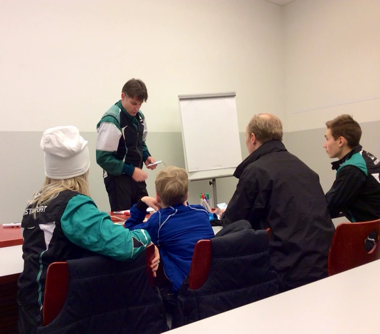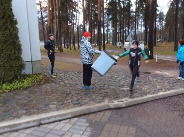 Leiri-info alkamassa.    Nuorten ja vähemmin rasteja kokeneiden suunnistajien rata kiersi 2,2 km lenkin. Karttaa oli muokattu niin, että pari ensimmäistä rastia meni maastoon totutellessa. Toisen rastin jälkeen kartasta häipyi vähitellen informaatio muuttuen hetkeksi käyräkartaksi. Rastiväli 3-4 meni väyläkarttana, tosin helposti polkua pitkin. 4-5 väli oli lähes tyhjää eli suunnassa piti pysyä. Samoin 5-6. Tästä vaikean supparastin kautta maaliin ja suihkuun.    Kokeneemmat ja kokeilunhaluisemmat saivat samankaltaista karttapähkinää 4,5 km verran. Harjoitusta pidettiin haastavana ja hyödyllisenä. Pieni tihkuinen räntäsadekaan ei pahemmin haitannut, mutta kasteli kyllä suunnistajat sitäkin tehokkaammin.    Majoittumisen jälkeen odoteltiin hetki, kunnes pääsimme nauttimaan opiston herkullisesta päivällisestä. Ruokailun jälkeen käytiin edellinen harjoitus läpi. Sitten suunta otettiin tatamille, jossa yhteisohjauksella huolsimme lihakset ennen uimahalliin siirtymistä.    Iltapalan jälkeen on jo ajatukset huomisessa juoksutekniikkaharjoituksessa sekä iltapäivän sprinttiviestissä. Huomenna selviää myös, miten muovailuvaha liittyy suunnistusharjoitteluun.  Kiitos päivän ratamestari Harrille ja treenin organisoineelle Antille.