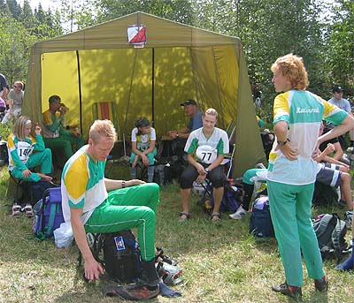 Helteessä kannattaa ottaa iisisti ennen omaa lähtöä. Varsaleiriä Lahti-Suunnistuksessa 2006.