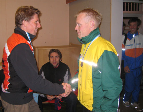 Janne ja Esa.    2000-luvun kestomenestyjä yössä, kovavauhtinen Vestolan Heikki, hukkasi aivan viime metreillä mitalisijan lähes 3 minuutin rastinottohakuun. Silti viime vuoden sija toistui eli hienosti 5. palkintosija.    Muista varsoista Henry Nyberg jatkoi tasaista SM-sarjaa ollen nyt 8., Larion Heikki kokeneena yökettuna 12. Markku Hämäläinen 15. ja Lepolan Sanni yhdellä "isolla" 16.    Tarkemmat tulokset, väliajat, reittihärveli, kuvia ym. Paimion Rastin kisasivuilla.H35 : 9.4 km  1. Janne Salmi TuS 1.01.50   2. Esa Orava RaVa 1.04.07 +2.17   25. Jarkko Ryyppö RaVa 1.20.48 +18.58   48. Jyrki Tuokko RaVa 1.39.45 +37.55     H45 : 7.6 km  1. Juhani Jetsonen KuoSu 58.05   5. Heikki Vestola RaVa 1.00.26 +2.21   15. Markku Hämäläinen RaVa 1.05.50 +7.45     H50 : 6.9 km  1. Risto Airaksinen OuTa 56.59   8. Henry Nyberg RaVa 1.02.56 +5.57     H70 : 3.5 km  1. Aimo Rantio HauSi 39.48   12. Heikki Lario RaVa 46.59 +7.11     D16 : 4.8 km  1. Venla Niemi TP 37.52   16. Sanni Lepola RaVa 48.16 +10.24 Kauden SM-kisat toivat yhteensä 6 mitalia : 1 kullan (Mika), 4 hopeaa (Kaija, Mika, Esa, H-35) ja 1 pronssin (H55).    Kisakausi jatkuu ensi sunnuntaina seuran mestaruuskilpailuilla Salusjärven leirikeskuksesta klo 10.00, lähde mukaan harjoittelemaan syksyn massaviesteihin!